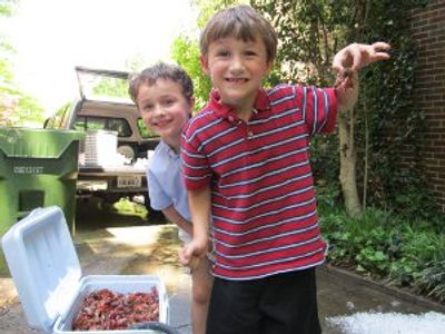 Two of my boys (ca. 2011), doing quality control on the crawfish.